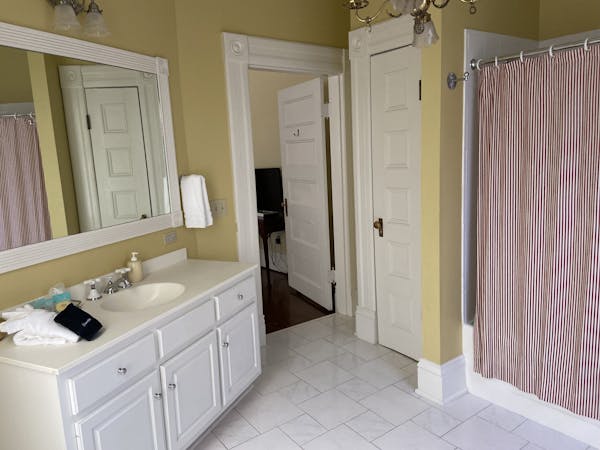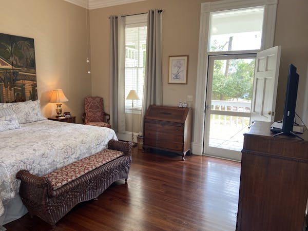 This queen bedroom is in the Historic Mansion and features a large private bathroom, air conditioning and cable TV. The corner room offers views to downtown North Augusta and the side yard of the property. It is a popular choice for brides to prepare for their big day!
