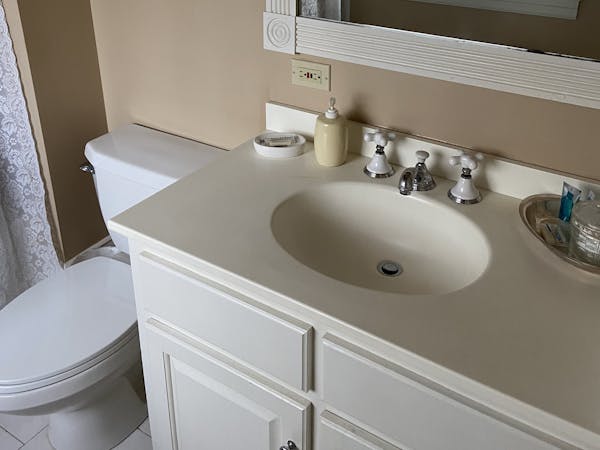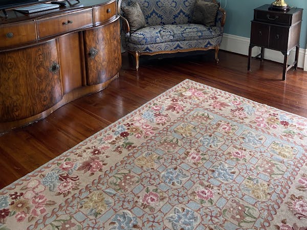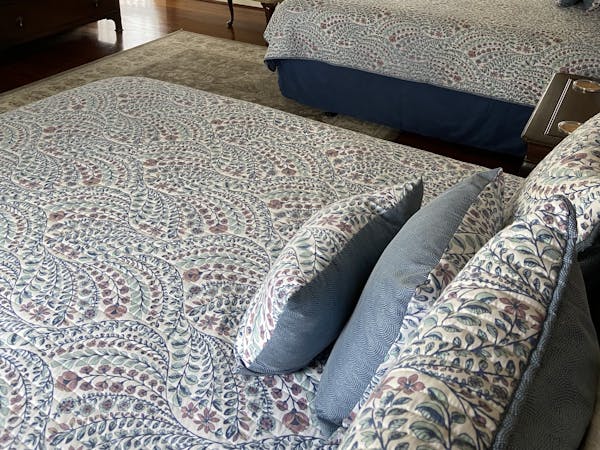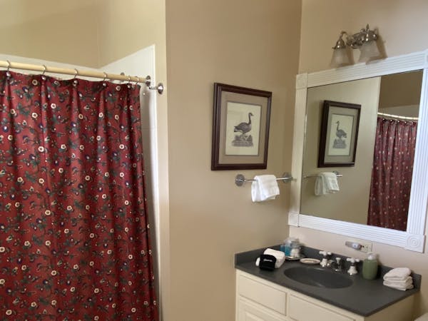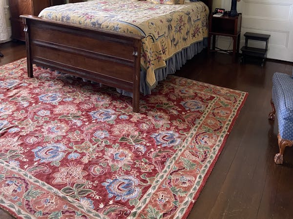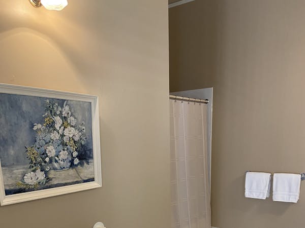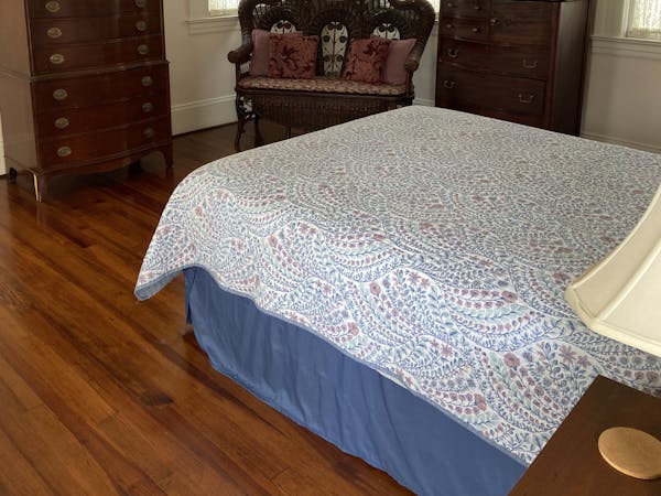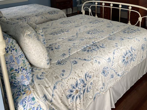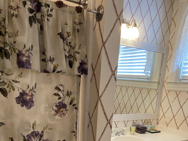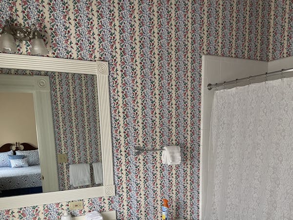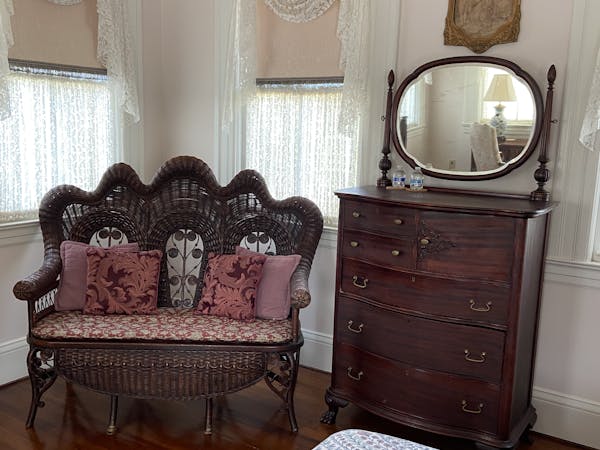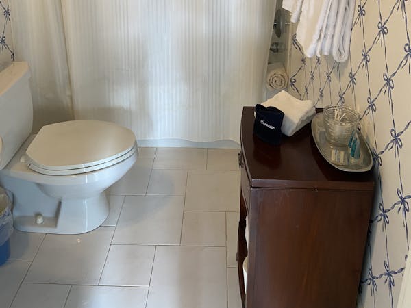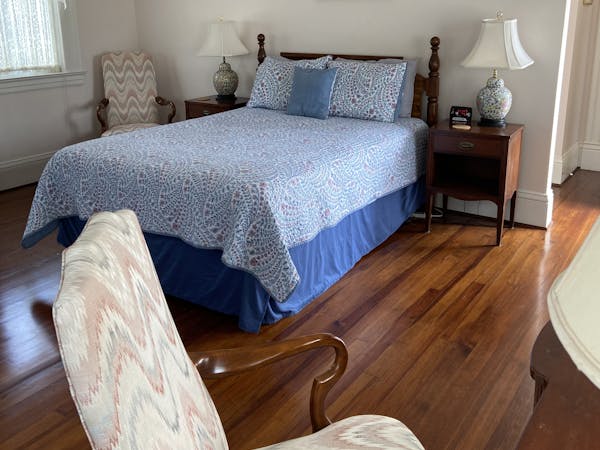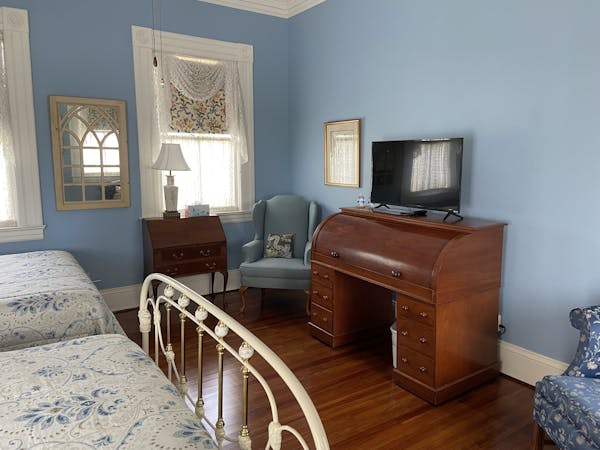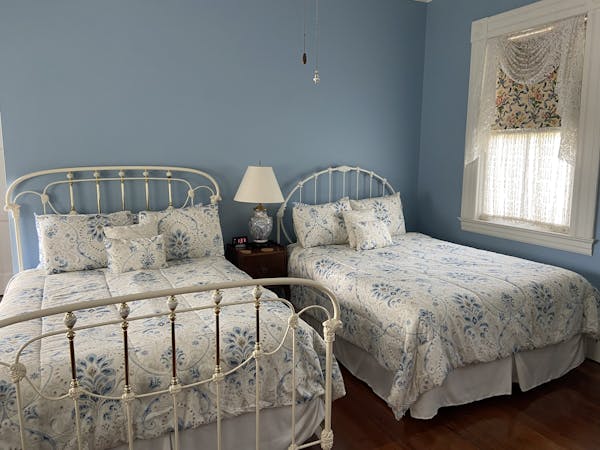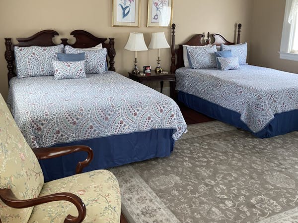This double queen room has a private bath and air conditioning. It is accessible via stairs. It includes a unique antique buffet that doubles as a TV stand. Bathroom closet provides additional storage. A wicker love seat adds to the charm of this bright and pleasant room.