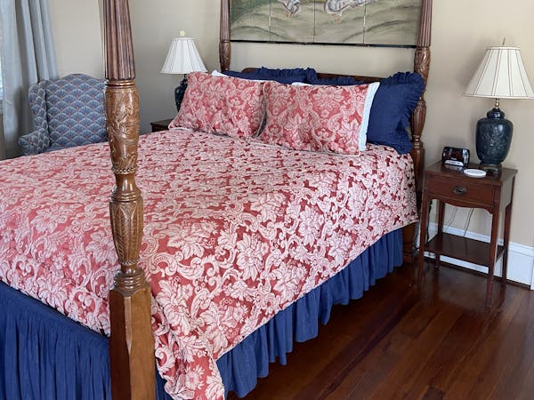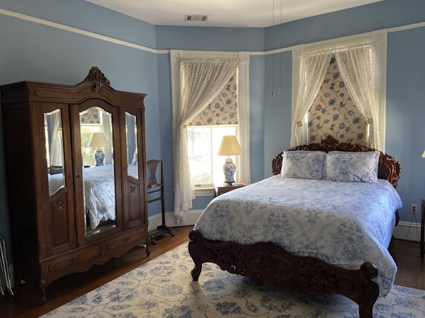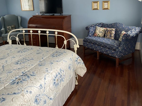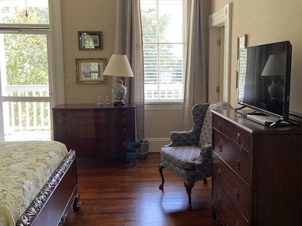 This first floor ADA compliant room is appointed with antique poster queen bed, period furniture, armoire and chair. All rooms include cable TV, wireless internet, heat and A/C, ceiling fans. Easily accessible with a concrete ramp and handicap parking, the room is ideal for those challenged by stairs.