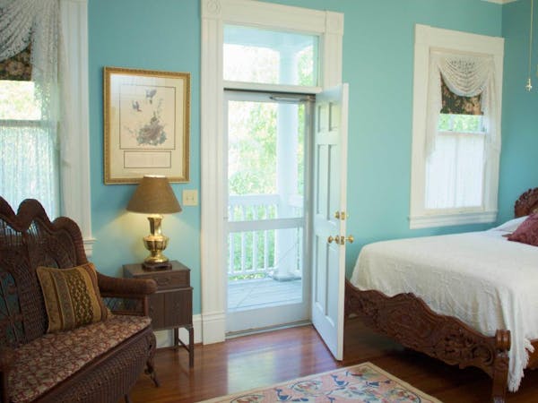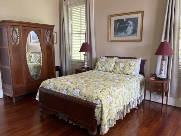 This queen bedroom is in the Historic Mansion and features beautiful antique furnishings, private bath, wifi and cable TV. This lovely room is quite the favorite with the camellia garden and courtyard view, bay windows and large floor dressing mirror.
