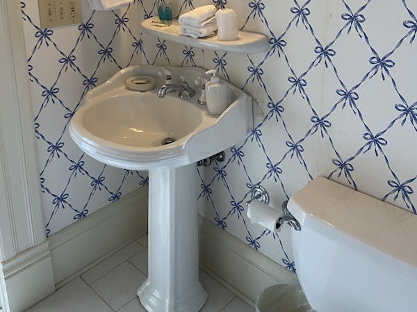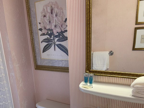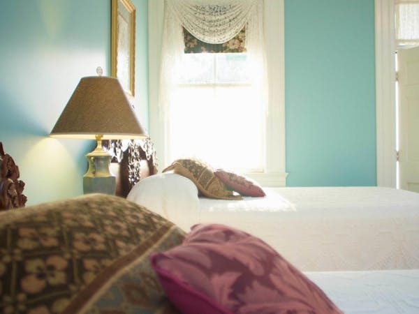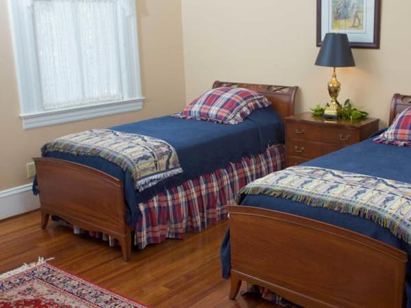 Gardenia includes a two queen beds, love seat. private bath and closet, cable TV, wireless internet and period secretary's desk. This upstairs room can be combined with 220 Rosemary as connecting, ideal for groups, teenage children or friends looking to gather without leaving the comfort of their room.