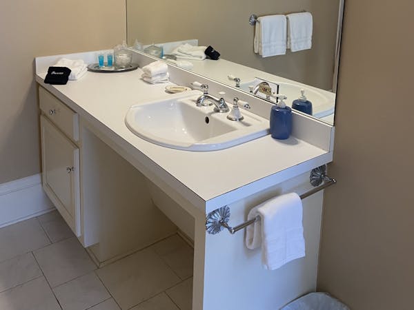 This double queen room features first floor access, cable TV, air conditioning and spacious accommodations.Matching antique queen beds are accompanied with a work desk and several chairs for additional comfort. Easy access to the courtyard and fountain!