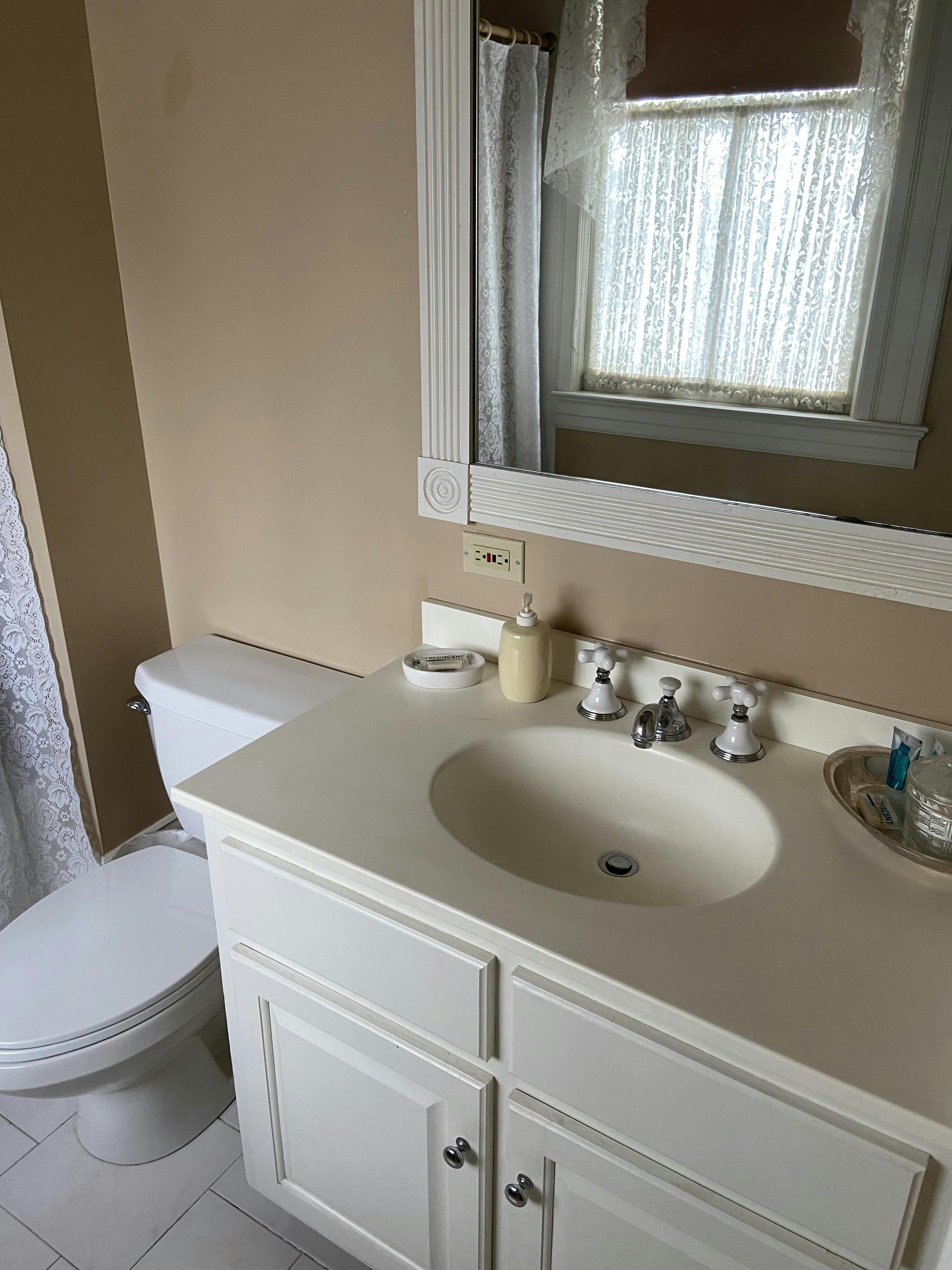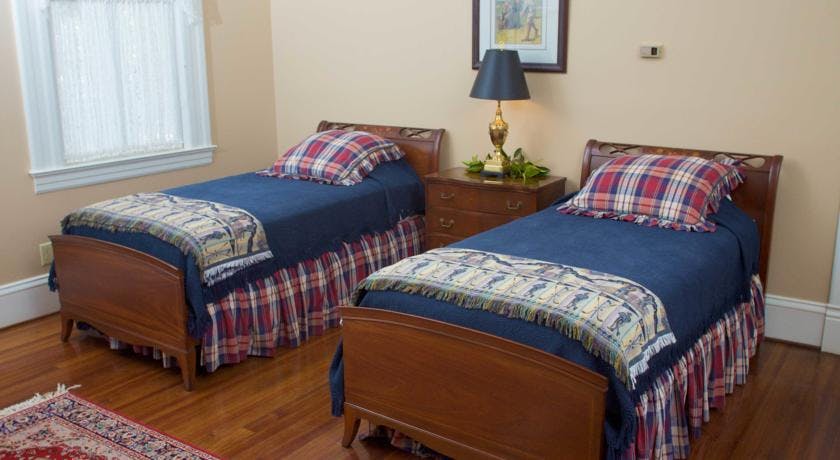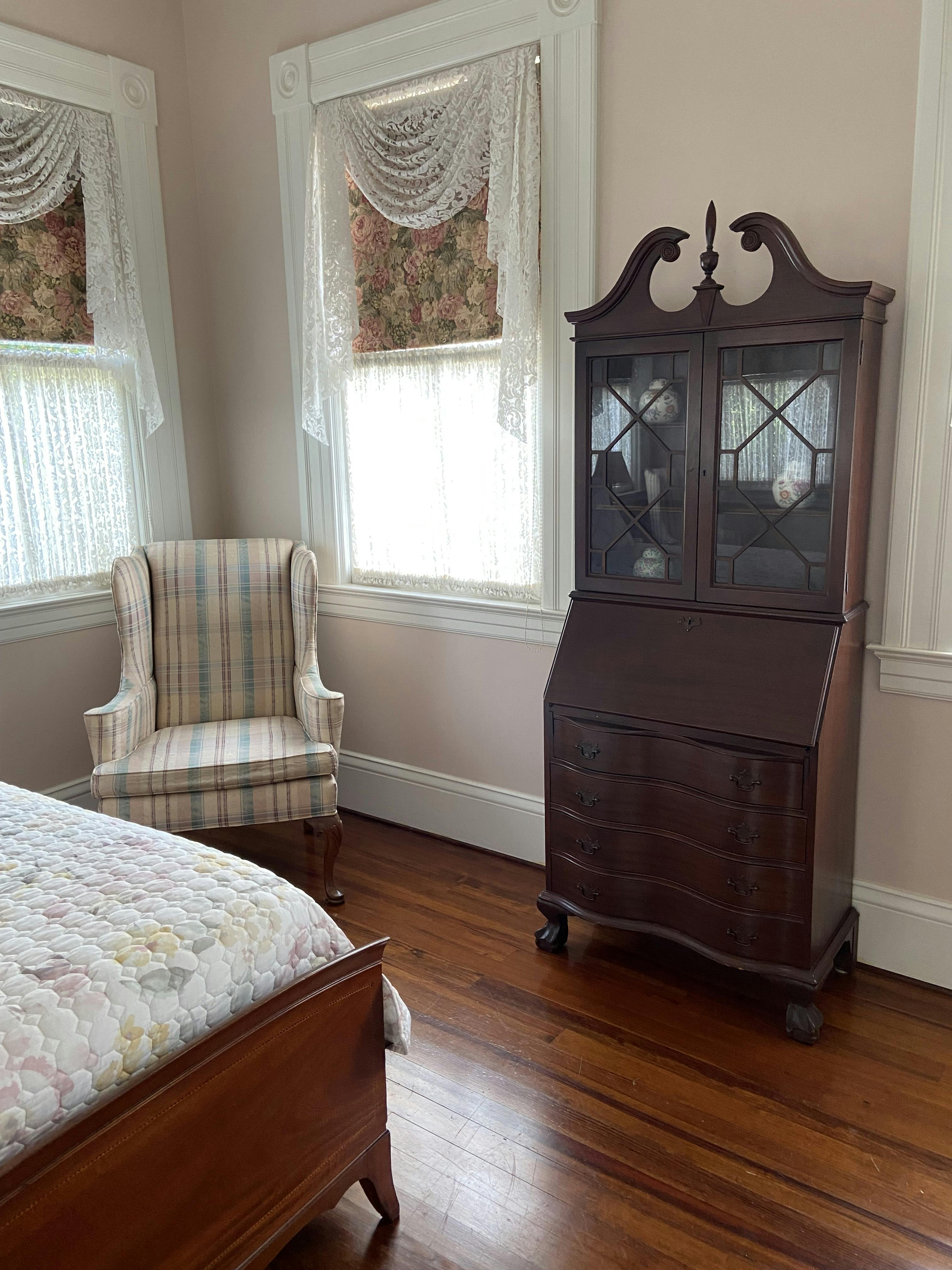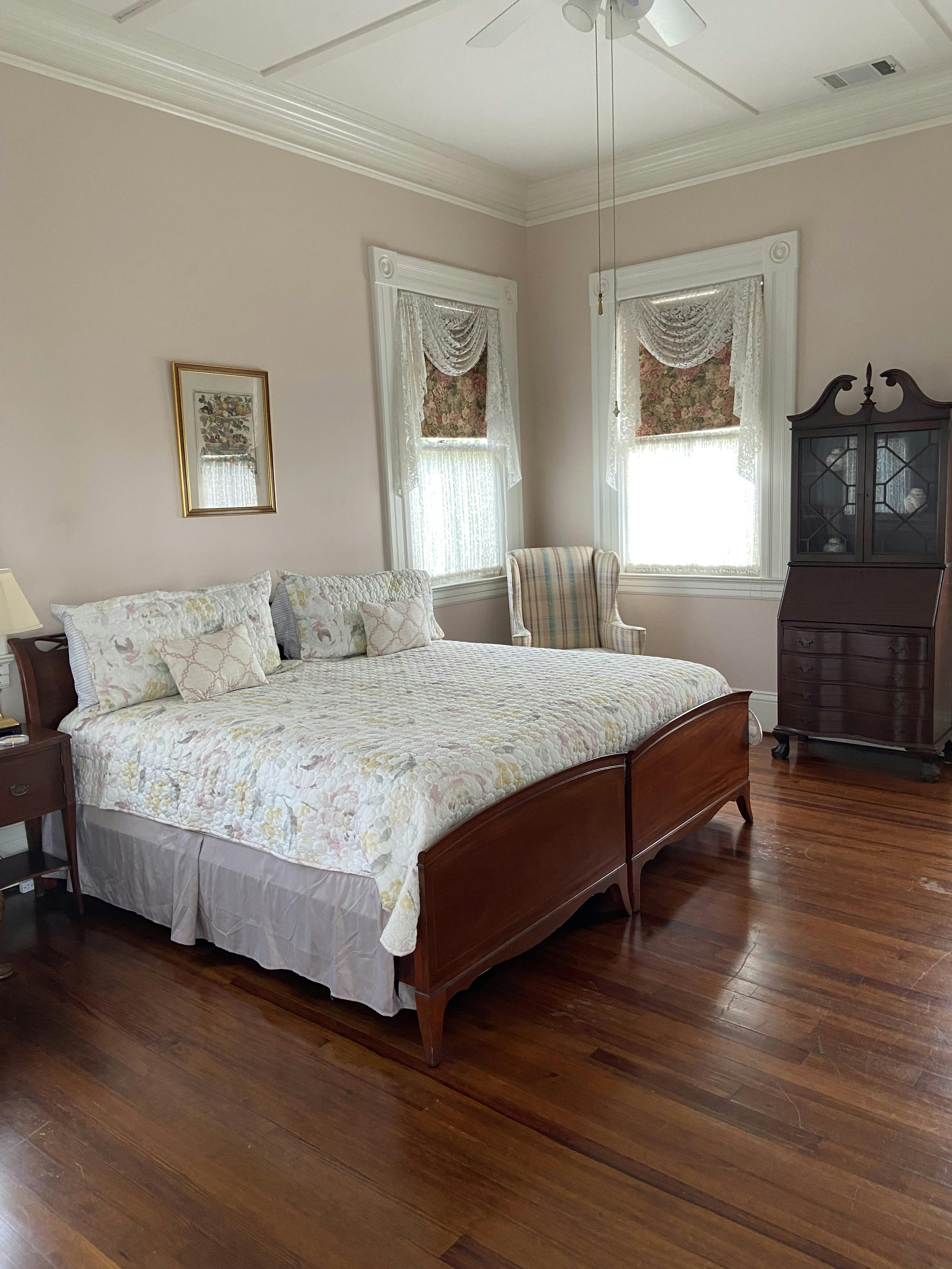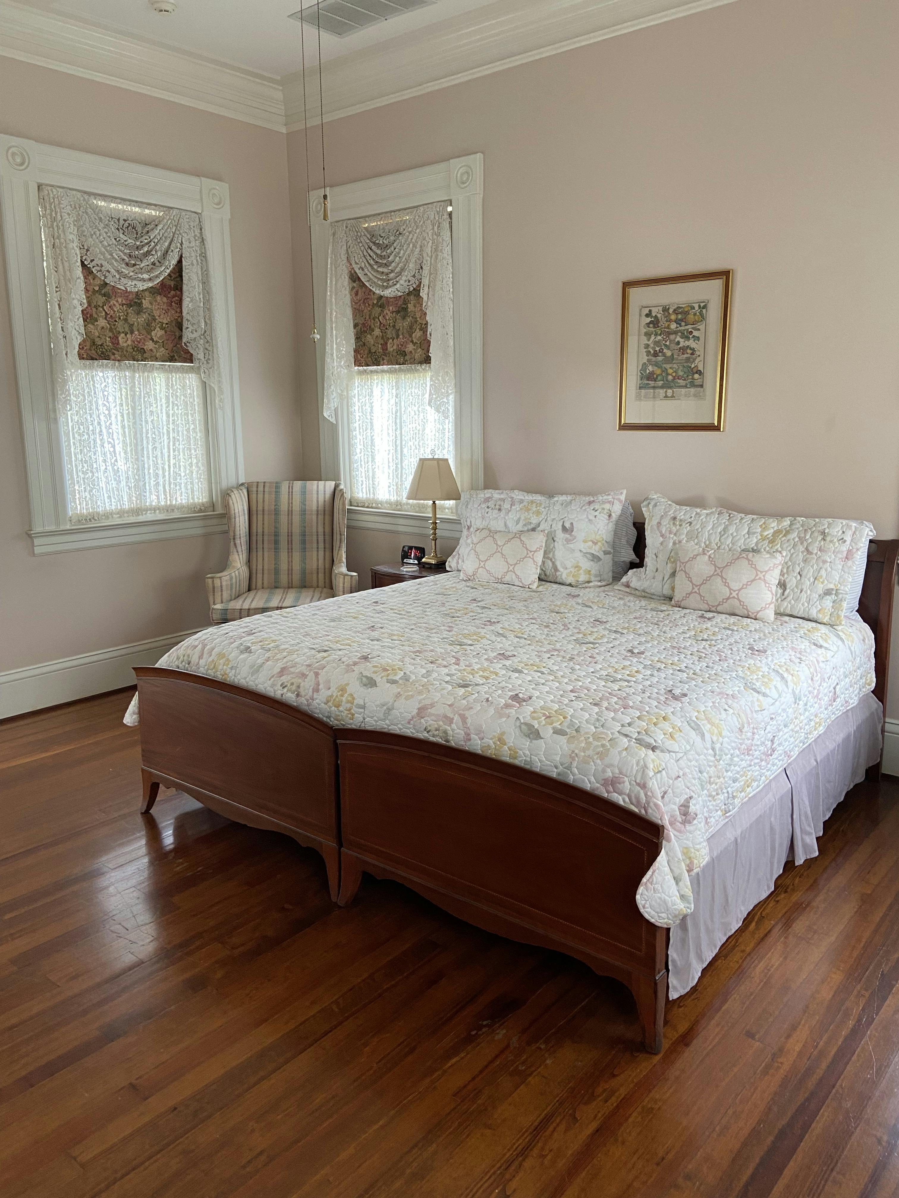 This room is upstairs and has a bed convertible between two twins and a king. Please specify your choice of arrangements. Private bath, AC, Wi-Fi and cable TV are standard in all our rooms.